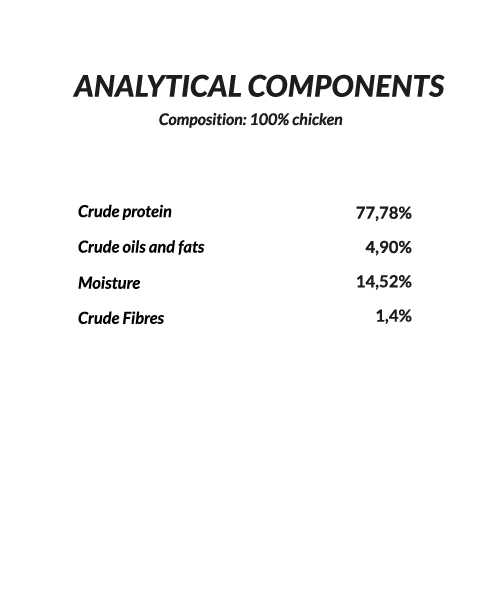 Chicken meat (92.68%), glycerin (6.66%) and salt (0.66%)