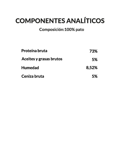 Carne de pato (92.68%), glicerina (6.66%) y sal (0.66%)